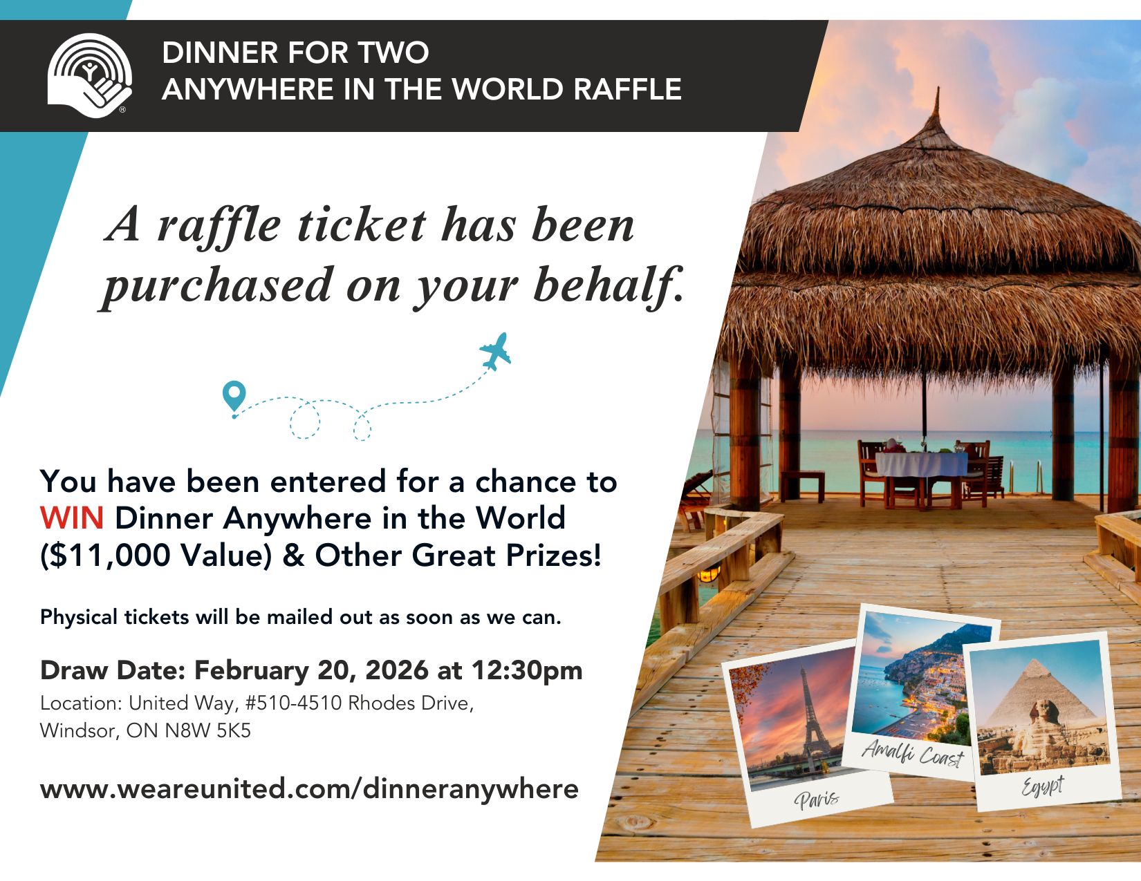 Thank you for purchasing Dinner Anywhere in the World for Two tickets! Your tickets will be sent out in the mail as soon as we can or available at the office shortly. But don’t worry—you don’t need your physical ticket in hand to win! Your entry is securely recorded, so you’re in the draw no matter what.